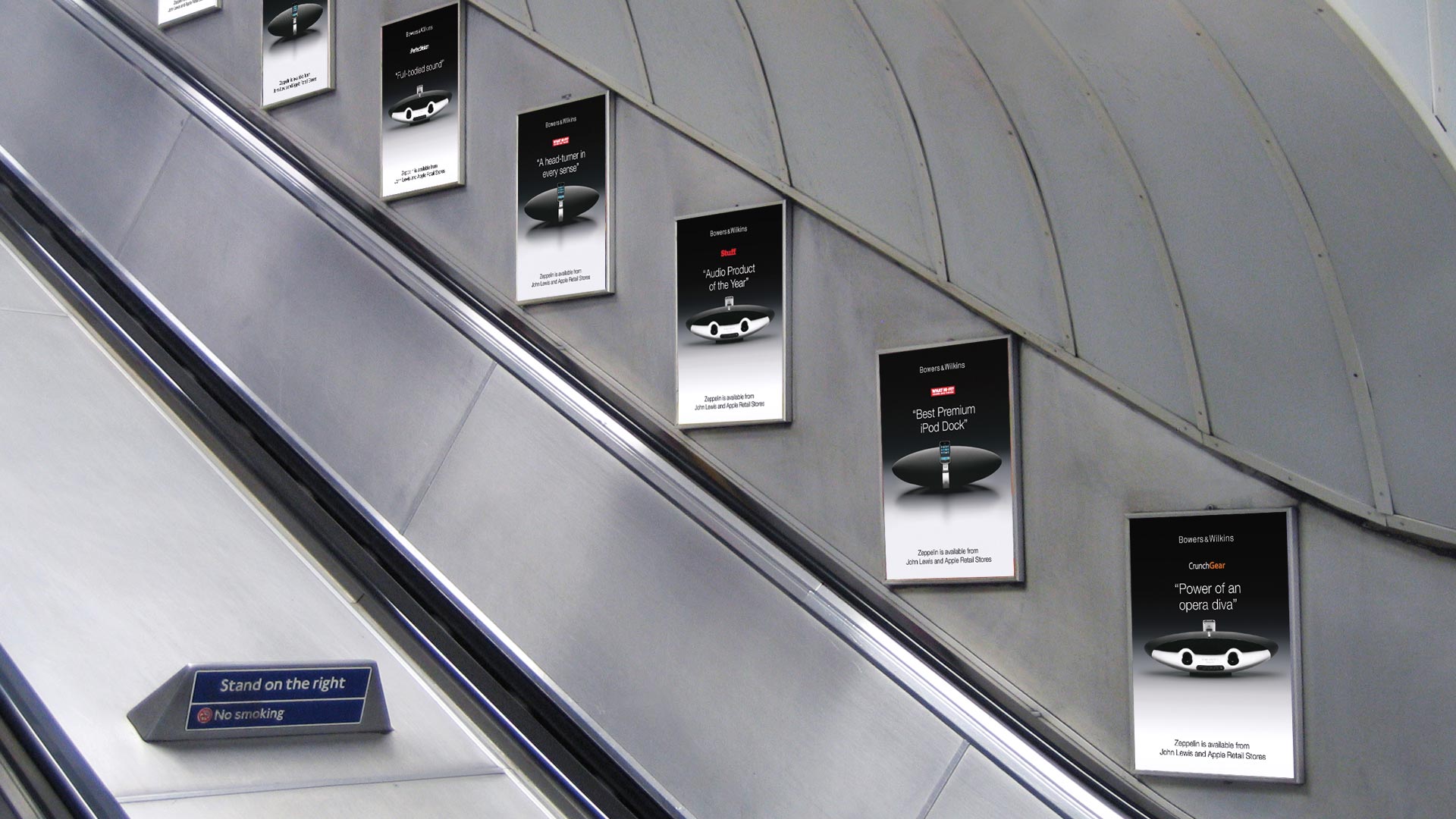 The final clincher were localised campaigns in the vicinity of major retail outlets. In London's Oxford Street, bus passengers were invited to 'Unbox your music' at every bus stop, tube users were confronted with an entire escalator full of posters relaying the most recent reviews of the product. By the time they reached the top there was no escaping, they walked straight into the Apple Store or John Lewis.