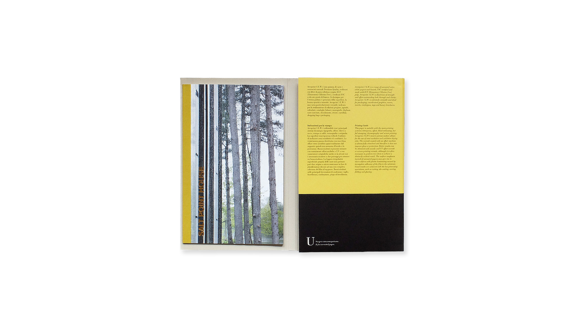 Fedrigoni Arcoprint visual book sfoggia tutte le più elaborate tecniche di produzione per mostrare come questa carta può essere utilizzata per rendere al meglio. Un piccolo colpo di scena su un tema molto versatile è introdotto attraverso il suo contenuto editoriale. Questa libro promozionale è infatti dedicato a Salt Point House una meraviglia per la sua architettura e design nella Hudson Valley di New York.